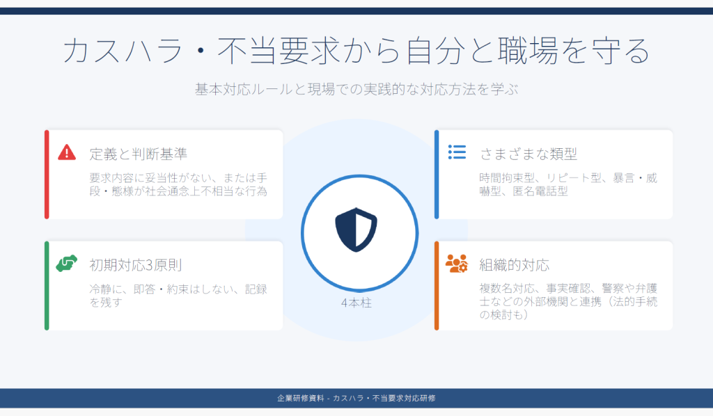 今回の研修では、以下の「4本柱」を軸とした対応ルールの確認を行いました。